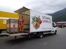 Mit einem Fassungsvermögen von fast 15 m³ ist der "Grümpelsammler" das ideale Abholfahrzeug und zudem mit einer praktischen Hebebühne ausgestattet.